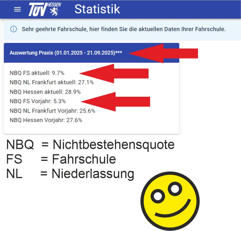 Wir haben (wie letztes Jahr) einstellige Nichtbestehensquoten in der Fahrschule Cruise-Control. Im Vergleich zur Verwaltung TÜV Frankfurt (21,1%) und hessenweit (28,9%) laut Grafik vom 21.09.2025. Somit haben wir auch keinen Stau bei den Praxisprüfungen.